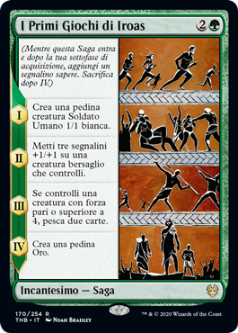 | Rules | (As this Saga enters and after your draw step, add a lore counter. Sacrifice after IV.) I — Create a 1/1 white Human Soldier creature token. II — Put three +1/+1 counters on target creature you control. III — If you control a creature with power 4 or greater, draw two cards. IV — Create a Gold token. (It's an artifact with "Sacrifice this artifact: Add one mana of any color.") |