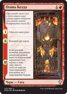 | Rules | (As this Saga enters and after your draw step, add a lore counter. Sacrifice after III.) I — Discard your hand. II — Draw two cards. III — If a red source you control would deal damage to a permanent or player this turn, it deals that much damage plus 2 to that permanent or player instead. |