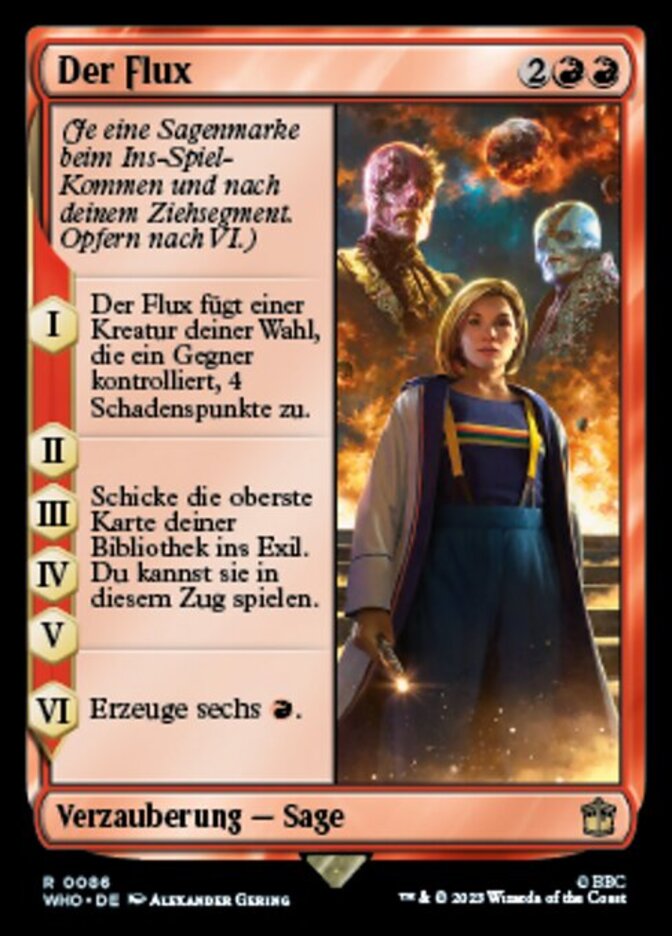 | Rules | (As this Saga enters and after your draw step, add a lore counter. Sacrifice after VI.) I — The Flux deals 4 damage to target creature an opponent controls. II, III, IV, V — Exile the top card of your library. You may play that card this turn. VI — Add six . |
