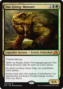| Rules | Deathtouch At the beginning of your upkeep, sacrifice The Gitrog Monster unless you sacrifice a land. You may play an additional land on each of your turns. Whenever one or more land cards are put into your graveyard from anywhere, draw a card. |