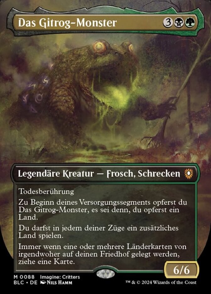 | Rules | Deathtouch At the beginning of your upkeep, sacrifice The Gitrog Monster unless you sacrifice a land. You may play an additional land on each of your turns. Whenever one or more land cards are put into your graveyard from anywhere, draw a card. |