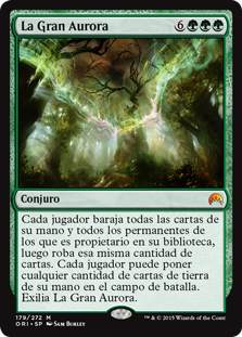 | Rules | Each player shuffles all cards from their hand and all permanents they own into their library, then draws that many cards. Each player may put any number of land cards from their hand onto the battlefield. Exile The Great Aurora. |