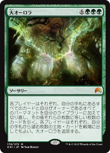 | Rules | Each player shuffles all cards from their hand and all permanents they own into their library, then draws that many cards. Each player may put any number of land cards from their hand onto the battlefield. Exile The Great Aurora. |