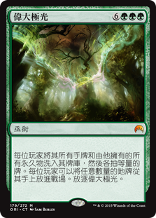 | Rules | Each player shuffles all cards from their hand and all permanents they own into their library, then draws that many cards. Each player may put any number of land cards from their hand onto the battlefield. Exile The Great Aurora. |