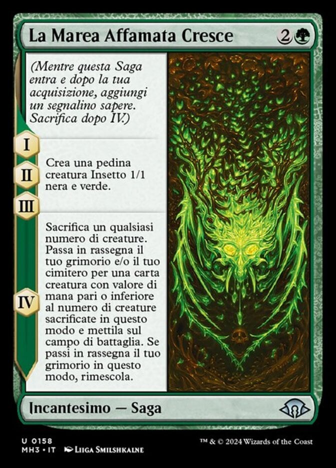 | Rules | (As this Saga enters and after your draw step, add a lore counter. Sacrifice after IV.) I, II, III — Create a 1/1 black and green Insect creature token. IV — Sacrifice any number of creatures. Search your library and/or graveyard for a creature card with mana value less than or equal to the number of creatures sacrificed this way and put it onto the battlefield. If you search your library this way, shuffle. |