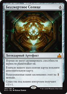 | Rules | Players can't activate planeswalkers' loyalty abilities. At the beginning of your draw step, draw an additional card. Spells you cast cost less to cast. Creatures you control get +1/+1. |
