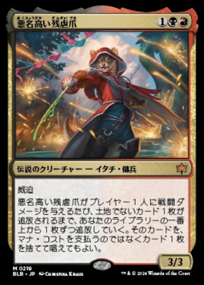 | Rules | Menace Whenever The Infamous Cruelclaw deals combat damage to a player, exile cards from the top of your library until you exile a nonland card. You may cast that card by discarding a card rather than paying its mana cost. |