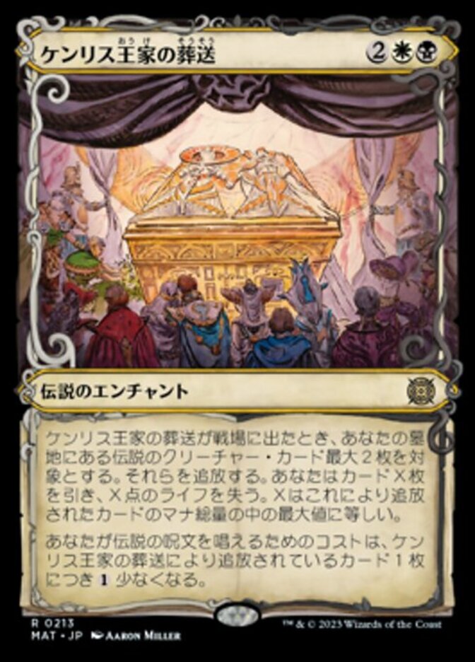 | Rules | When The Kenriths' Royal Funeral enters the battlefield, exile up to two target legendary creature cards from your graveyard. You draw X cards and you lose X life, where X is the greatest mana value among cards exiled this way. Legendary spells you cast cost less to cast for each card exiled with The Kenriths' Royal Funeral. |