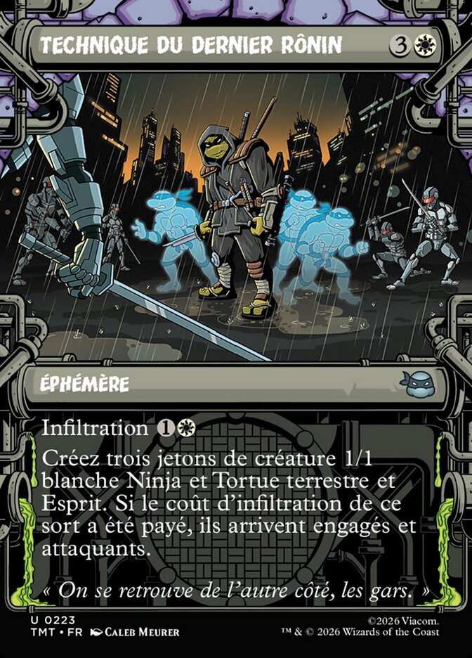 | Rules | Sneak (You may cast this spell for if you also return an unblocked attacker you control to hand during the declare blockers step.) Create three 1/1 white Ninja Turtle Spirit creature tokens. If this spell's sneak cost was paid, they enter tapped and attacking. |