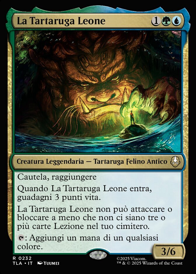 | Rules | Vigilance, reach When The Lion-Turtle enters, you gain 3 life. The Lion-Turtle can't attack or block unless there are three or more Lesson cards in your graveyard. : Add one mana of any color. |