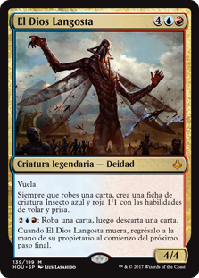 | Rules | Flying Whenever you draw a card, create a 1/1 blue and red Insect creature token with flying and haste. : Draw a card, then discard a card. When The Locust God dies, return it to its owner's hand at the beginning of the next end step. |