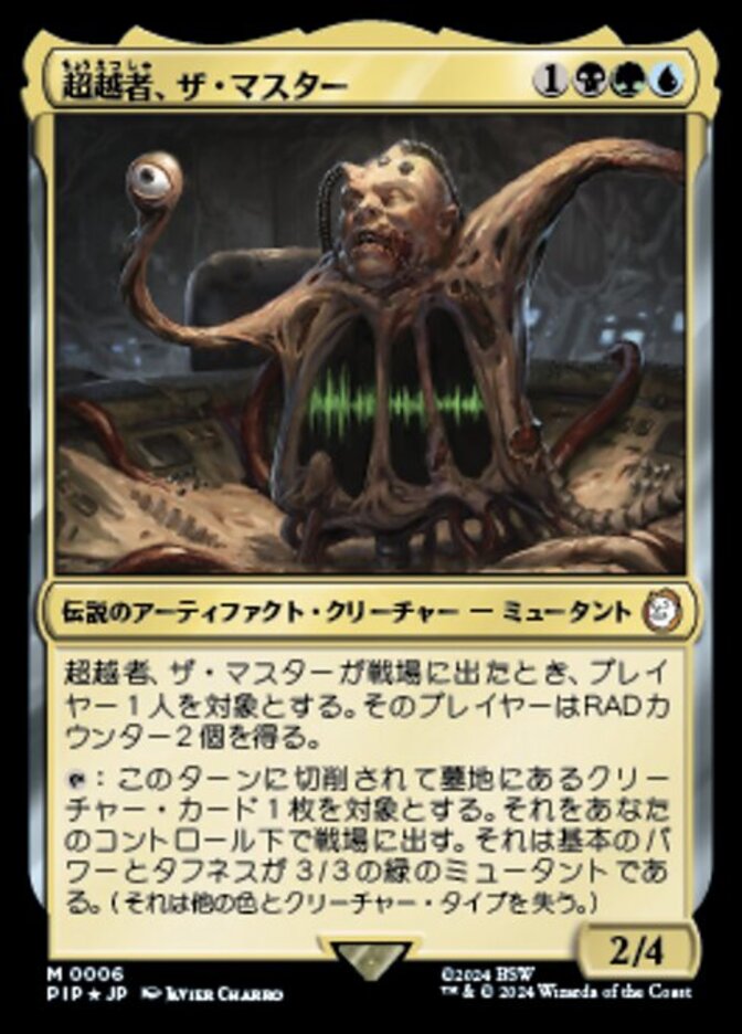 | Rules | When The Master, Transcendent enters the battlefield, target player gets two rad counters. : Put target creature card in a graveyard that was milled this turn onto the battlefield under your control. It's a green Mutant with base power and toughness 3/3. (It loses its other colors and creature types.) |