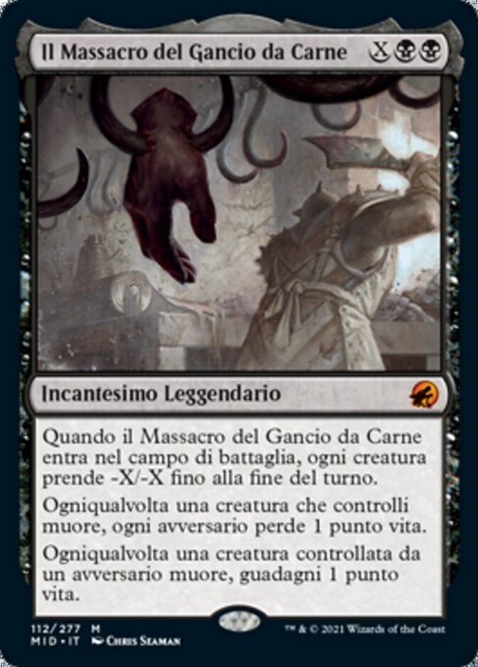 | Rules | When The Meathook Massacre enters the battlefield, each creature gets -X/-X until end of turn. Whenever a creature you control dies, each opponent loses 1 life. Whenever a creature an opponent controls dies, you gain 1 life. |