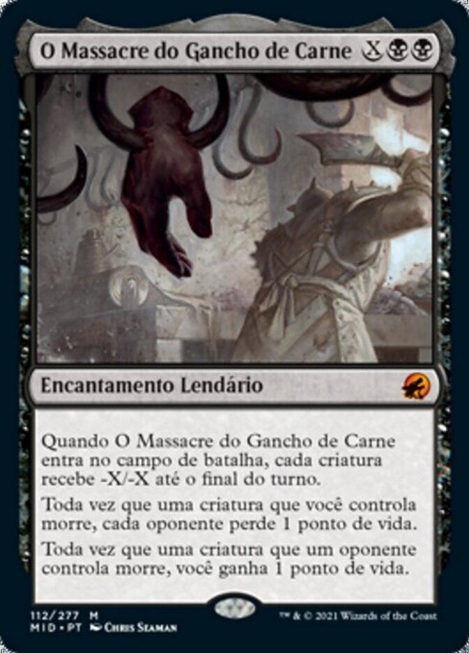 | Rules | When The Meathook Massacre enters the battlefield, each creature gets -X/-X until end of turn. Whenever a creature you control dies, each opponent loses 1 life. Whenever a creature an opponent controls dies, you gain 1 life. |