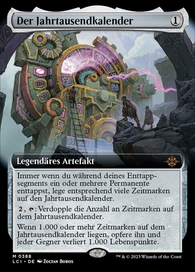 | Rules | Whenever you untap one or more permanents during your untap step, put that many time counters on The Millennium Calendar. , : Double the number of time counters on The Millennium Calendar. When there are 1,000 or more time counters on The Millennium Calendar, sacrifice it and each opponent loses 1,000 life. |