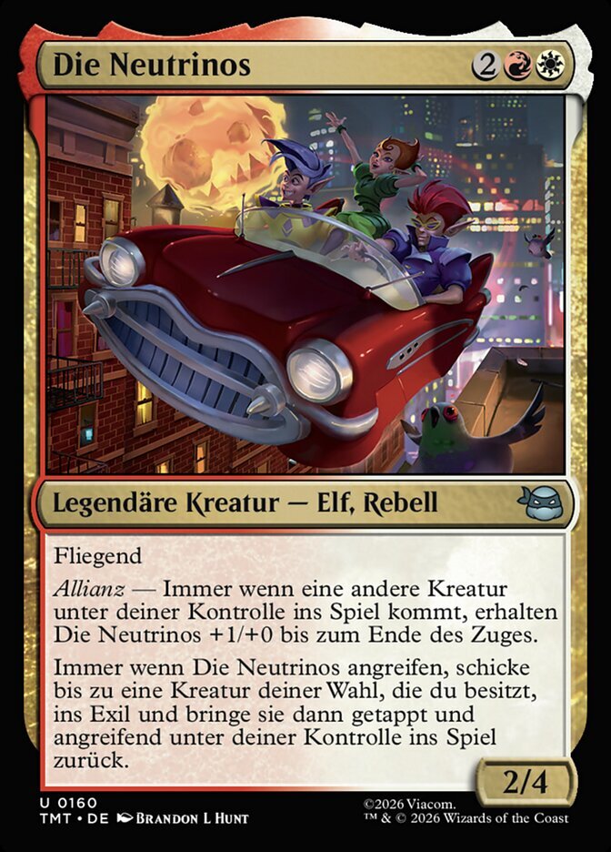 | Rules | Flying Alliance — Whenever another creature you control enters, The Neutrinos get +1/+0 until end of turn. Whenever The Neutrinos attack, exile up to one target creature you own, then return it to the battlefield under your control tapped and attacking. |