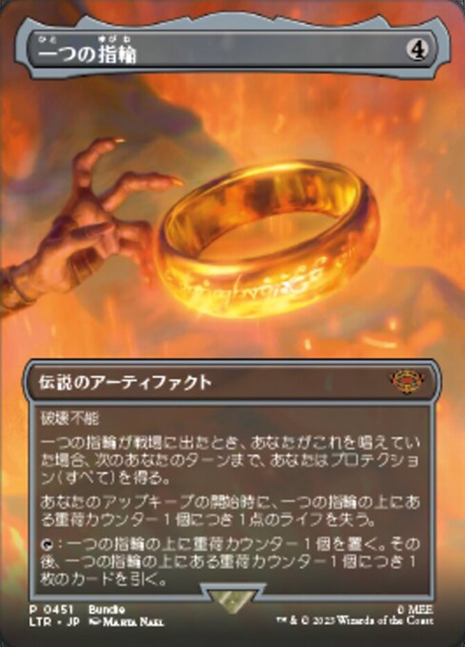 | Rules | Indestructible When The One Ring enters the battlefield, if you cast it, you gain protection from everything until your next turn. At the beginning of your upkeep, you lose 1 life for each burden counter on The One Ring. : Put a burden counter on The One Ring, then draw a card for each burden counter on The One Ring. |