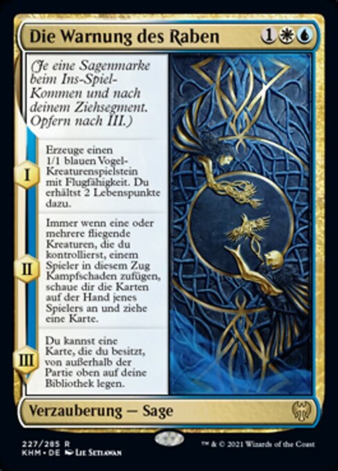 | Rules | (As this Saga enters and after your draw step, add a lore counter. Sacrifice after III.) I — Create a 1/1 blue Bird creature token with flying. You gain 2 life. II — Whenever one or more creatures you control with flying deal combat damage to a player this turn, look at that player's hand and draw a card. III — You may put a card you own from outside the game on top of your library. |
