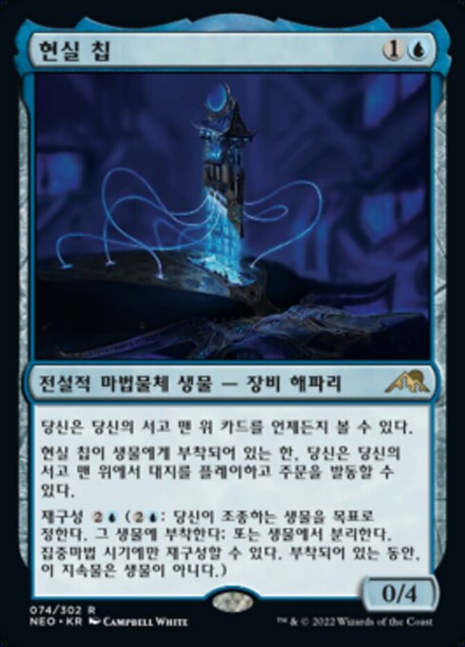 | Rules | You may look at the top card of your library any time. As long as The Reality Chip is attached to a creature, you may play lands and cast spells from the top of your library. Reconfigure (: Attach to target creature you control; or unattach from a creature. Reconfigure only as a sorcery. While attached, this isn't a creature.) |