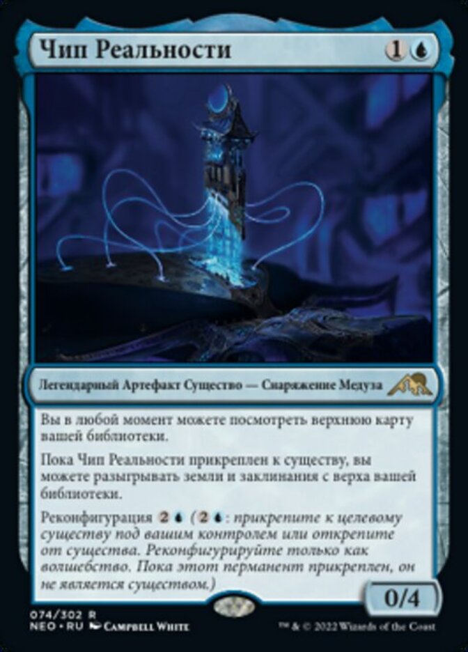 | Rules | You may look at the top card of your library any time. As long as The Reality Chip is attached to a creature, you may play lands and cast spells from the top of your library. Reconfigure (: Attach to target creature you control; or unattach from a creature. Reconfigure only as a sorcery. While attached, this isn't a creature.) |