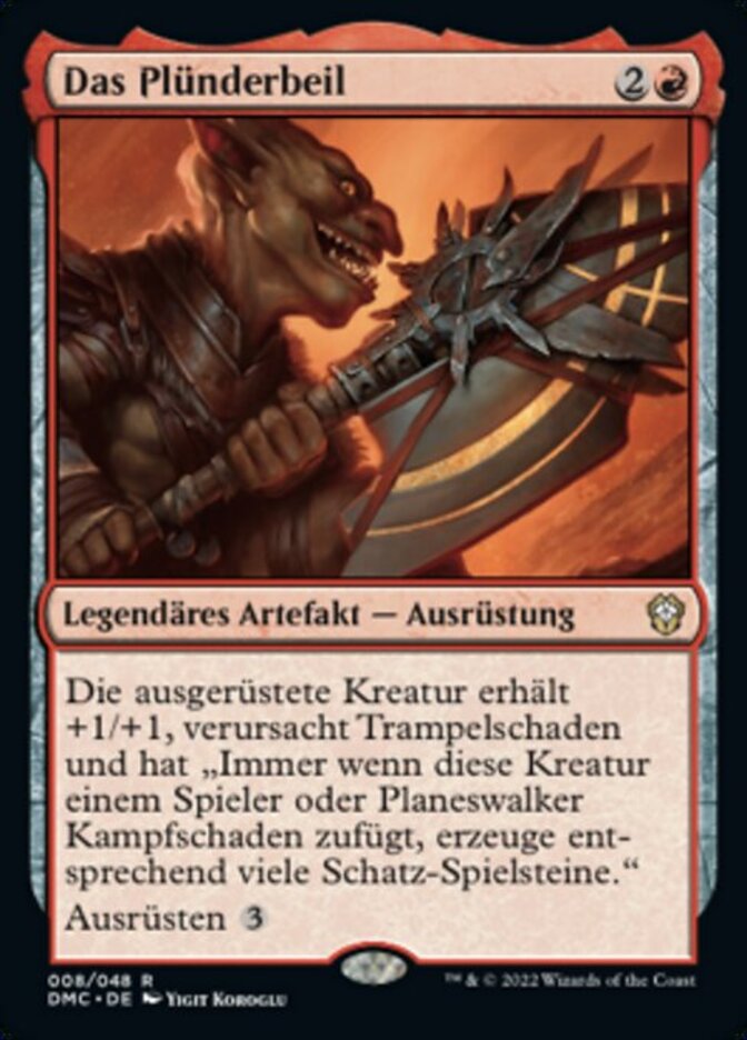 | Rules | Equipped creature gets +1/+1 and has trample and "Whenever this creature deals combat damage to a player or planeswalker, create that many Treasure tokens." Equip |