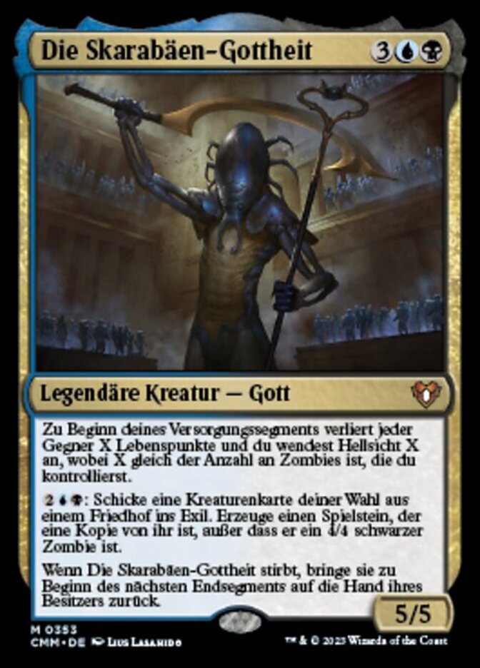 | Rules | At the beginning of your upkeep, each opponent loses X life and you scry X, where X is the number of Zombies you control. : Exile target creature card from a graveyard. Create a token that's a copy of it, except it's a 4/4 black Zombie. When The Scarab God dies, return it to its owner's hand at the beginning of the next end step. |