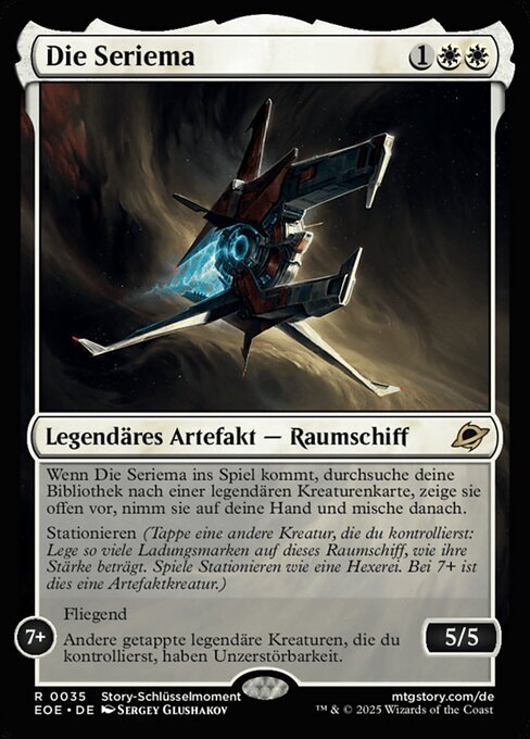 | Rules | When The Seriema enters, search your library for a legendary creature card, reveal it, put it into your hand, then shuffle. Station (Tap another creature you control: Put charge counters equal to its power on this Spacecraft. Station only as a sorcery. It's an artifact creature at 7+.) STATION 7+ Flying Other tapped legendary creatures you control have indestructible. |