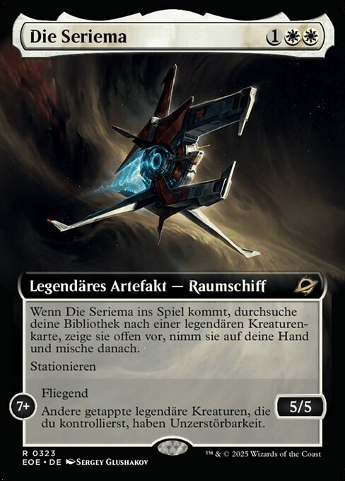 | Rules | When The Seriema enters, search your library for a legendary creature card, reveal it, put it into your hand, then shuffle. Station (Tap another creature you control: Put charge counters equal to its power on this Spacecraft. Station only as a sorcery. It's an artifact creature at 7+.) STATION 7+ Flying Other tapped legendary creatures you control have indestructible. |