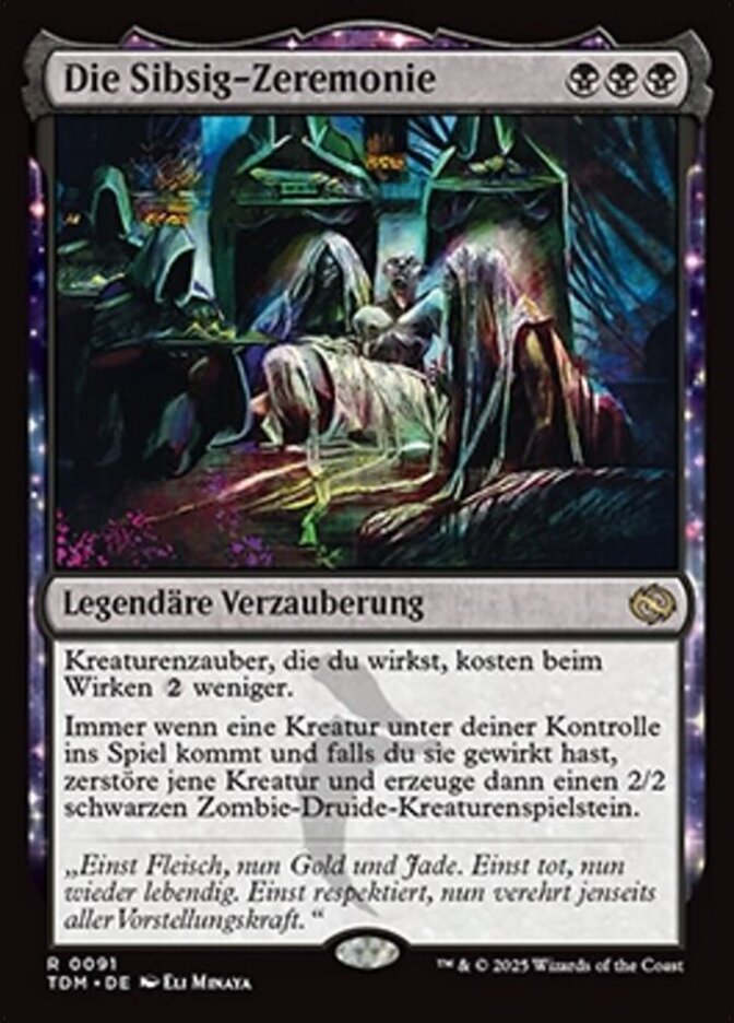 | Rules | Creature spells you cast cost less to cast. Whenever a creature you control enters, if you cast it, destroy that creature, then create a 2/2 black Zombie Druid creature token. |