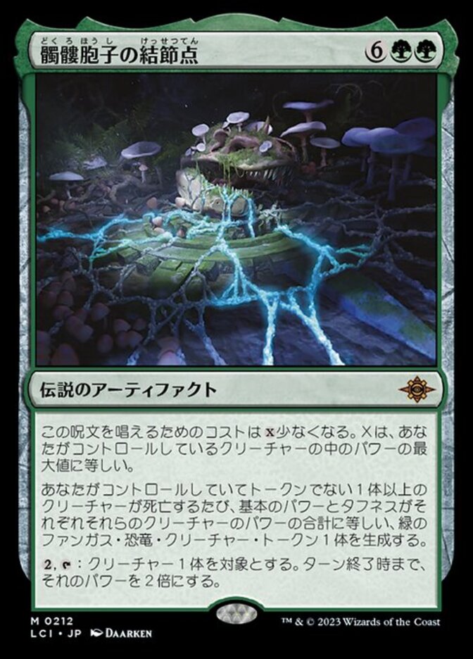 | Rules | This spell costs less to cast, where X is the greatest power among creatures you control. Whenever one or more nontoken creatures you control die, create a green Fungus Dinosaur creature token with base power and toughness each equal to the total power of those creatures. , : Double target creature's power until end of turn. |