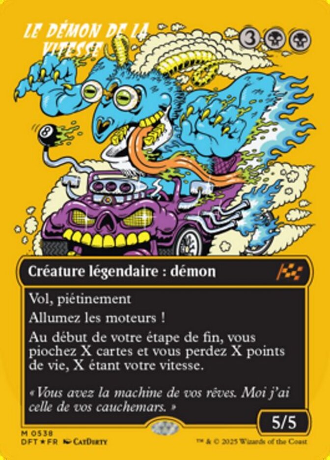 | Rules | Flying, trample Start your engines! (If you have no speed, it starts at 1. It increases once on each of your turns when an opponent loses life. Max speed is 4.) At the beginning of your end step, you draw X cards and lose X life, where X is your speed. |