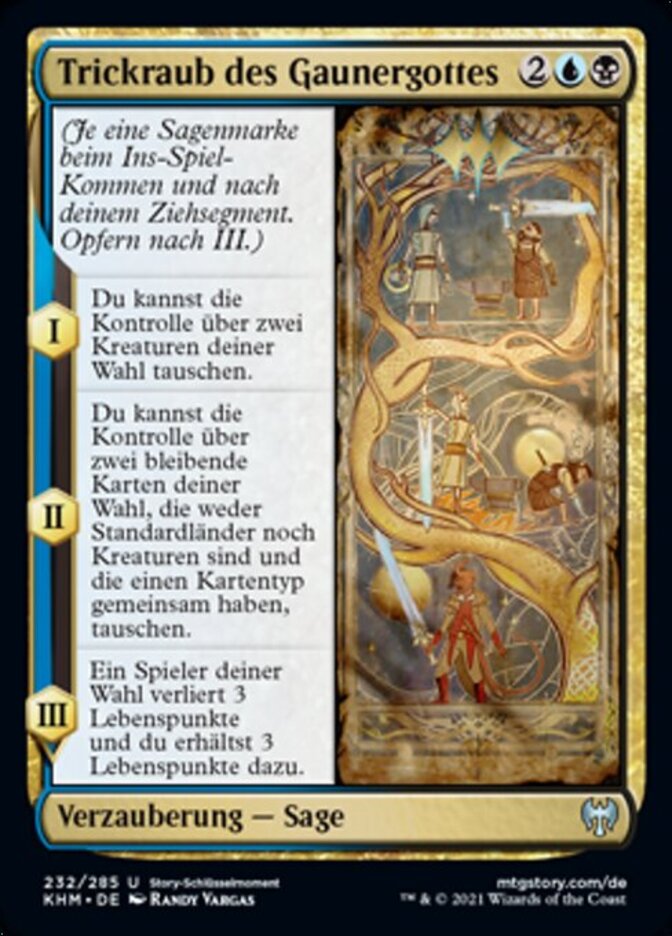 | Rules | (As this Saga enters and after your draw step, add a lore counter. Sacrifice after III.) I — You may exchange control of two target creatures. II — You may exchange control of two target nonbasic, noncreature permanents that share a card type. III — Target player loses 3 life and you gain 3 life. |