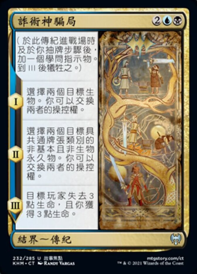 | Rules | (As this Saga enters and after your draw step, add a lore counter. Sacrifice after III.) I — You may exchange control of two target creatures. II — You may exchange control of two target nonbasic, noncreature permanents that share a card type. III — Target player loses 3 life and you gain 3 life. |