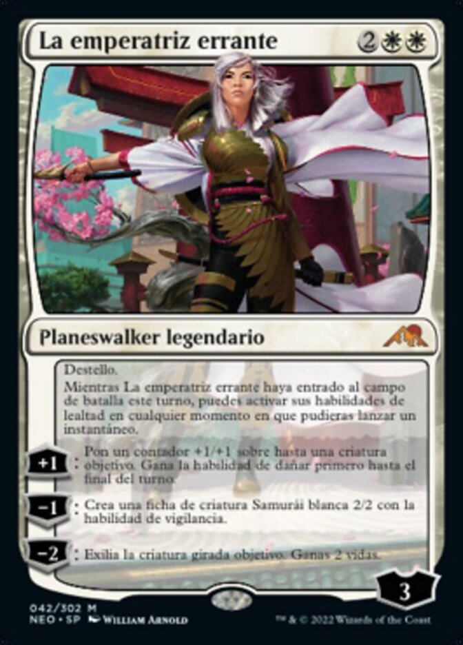| Rules | Flash As long as The Wandering Emperor entered the battlefield this turn, you may activate her loyalty abilities any time you could cast an instant. +1: Put a +1/+1 counter on up to one target creature. It gains first strike until end of turn. −1: Create a 2/2 white Samurai creature token with vigilance. −2: Exile target tapped creature. You gain 2 life. |