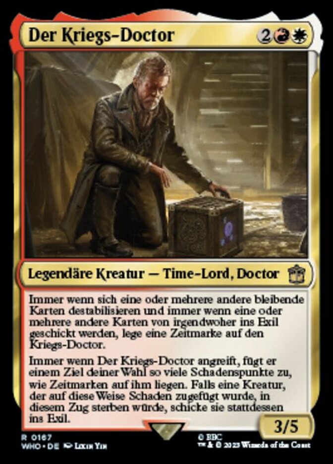 | Rules | Whenever one or more other permanents phase out and whenever one or more other cards are put into exile from anywhere, put a time counter on The War Doctor. Whenever The War Doctor attacks, it deals damage equal to the number of time counters on it to any target. If a creature dealt damage this way would die this turn, exile it instead. |