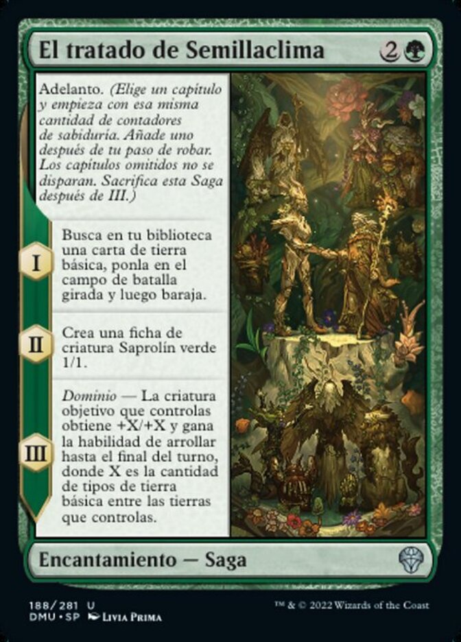 | Rules | Read ahead (Choose a chapter and start with that many lore counters. Add one after your draw step. Skipped chapters don't trigger. Sacrifice after III.) I — Search your library for a basic land card, put it onto the battlefield tapped, then shuffle. II — Create a 1/1 green Saproling creature token. III — Domain — Target creature you control gets +X/+X and gains trample until end of turn, where X is the number of basic land types among lands you control. |