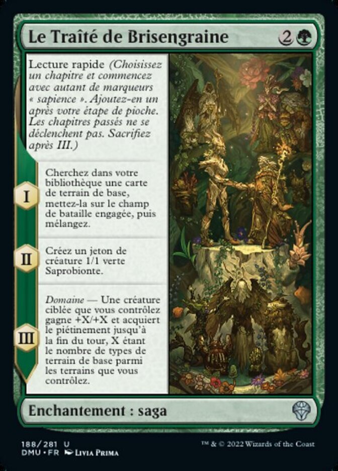 | Rules | Read ahead (Choose a chapter and start with that many lore counters. Add one after your draw step. Skipped chapters don't trigger. Sacrifice after III.) I — Search your library for a basic land card, put it onto the battlefield tapped, then shuffle. II — Create a 1/1 green Saproling creature token. III — Domain — Target creature you control gets +X/+X and gains trample until end of turn, where X is the number of basic land types among lands you control. |