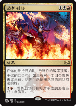 | Rules | At the beginning of your upkeep, exile the top card of your library. During your turn, if an opponent lost life this turn, you may play lands and cast spells from among cards exiled with Theater of Horrors. : Theater of Horrors deals 1 damage to target opponent or planeswalker. |