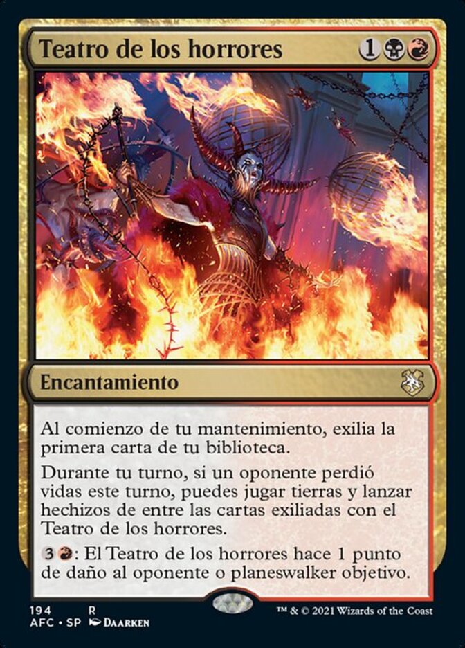| Rules | At the beginning of your upkeep, exile the top card of your library. During your turn, if an opponent lost life this turn, you may play lands and cast spells from among cards exiled with Theater of Horrors. : Theater of Horrors deals 1 damage to target opponent or planeswalker. |