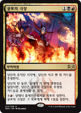 | Rules | At the beginning of your upkeep, exile the top card of your library. During your turn, if an opponent lost life this turn, you may play lands and cast spells from among cards exiled with Theater of Horrors. : Theater of Horrors deals 1 damage to target opponent or planeswalker. |
