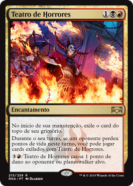 | Rules | At the beginning of your upkeep, exile the top card of your library. During your turn, if an opponent lost life this turn, you may play lands and cast spells from among cards exiled with Theater of Horrors. : Theater of Horrors deals 1 damage to target opponent or planeswalker. |