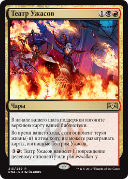| Rules | At the beginning of your upkeep, exile the top card of your library. During your turn, if an opponent lost life this turn, you may play lands and cast spells from among cards exiled with Theater of Horrors. : Theater of Horrors deals 1 damage to target opponent or planeswalker. |