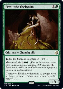 | Rules | All Saprolings get +1/+1. Morph (You may cast this card face down as a 2/2 creature for . Turn it face up any time for its morph cost.) When Thelonite Hermit is turned face up, create four 1/1 green Saproling creature tokens. |