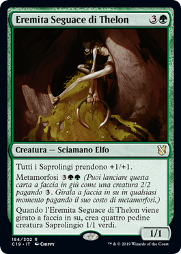 | Rules | All Saprolings get +1/+1. Morph (You may cast this card face down as a 2/2 creature for . Turn it face up any time for its morph cost.) When Thelonite Hermit is turned face up, create four 1/1 green Saproling creature tokens. |