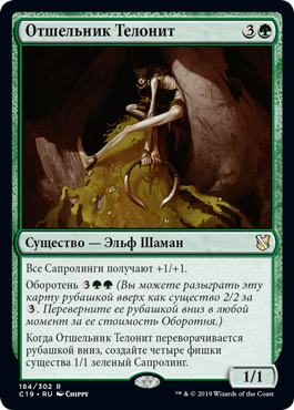 | Rules | All Saprolings get +1/+1. Morph (You may cast this card face down as a 2/2 creature for . Turn it face up any time for its morph cost.) When Thelonite Hermit is turned face up, create four 1/1 green Saproling creature tokens. |