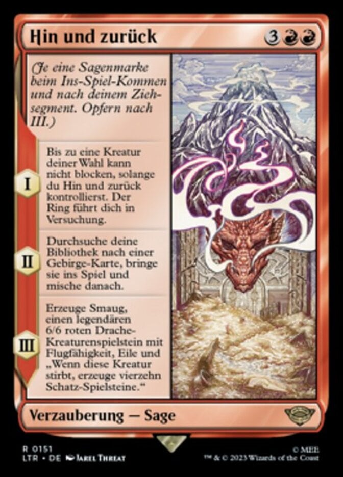 | Rules | (As this Saga enters and after your draw step, add a lore counter. Sacrifice after III.) I — Up to one target creature can't block for as long as you control There and Back Again. The Ring tempts you. II — Search your library for a Mountain card, put it onto the battlefield, then shuffle. III — Create Smaug, a legendary 6/6 red Dragon creature token with flying, haste, and "When this creature dies, create fourteen Treasure tokens." |