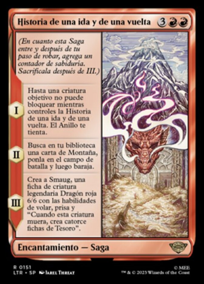 | Rules | (As this Saga enters and after your draw step, add a lore counter. Sacrifice after III.) I — Up to one target creature can't block for as long as you control There and Back Again. The Ring tempts you. II — Search your library for a Mountain card, put it onto the battlefield, then shuffle. III — Create Smaug, a legendary 6/6 red Dragon creature token with flying, haste, and "When this creature dies, create fourteen Treasure tokens." |