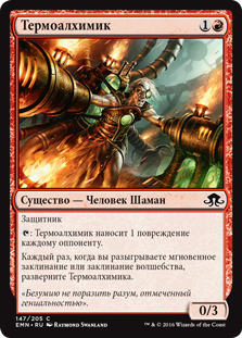 | Rules | Defender : Thermo-Alchemist deals 1 damage to each opponent. Whenever you cast an instant or sorcery spell, untap Thermo-Alchemist. |