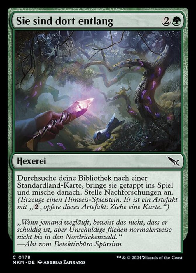 Rules Search your library for a basic land card, put it onto the battlefield tapped, then shuffle. Investigate. (Create a Clue token. It's an artifact with ", Sacrifice this artifact: Draw a card.")