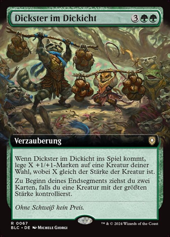 | Rules | When Thickest in the Thicket enters, put X +1/+1 counters on target creature, where X is that creature's power. At the beginning of your end step, draw two cards if you control the creature with the greatest power or tied for the greatest power. |